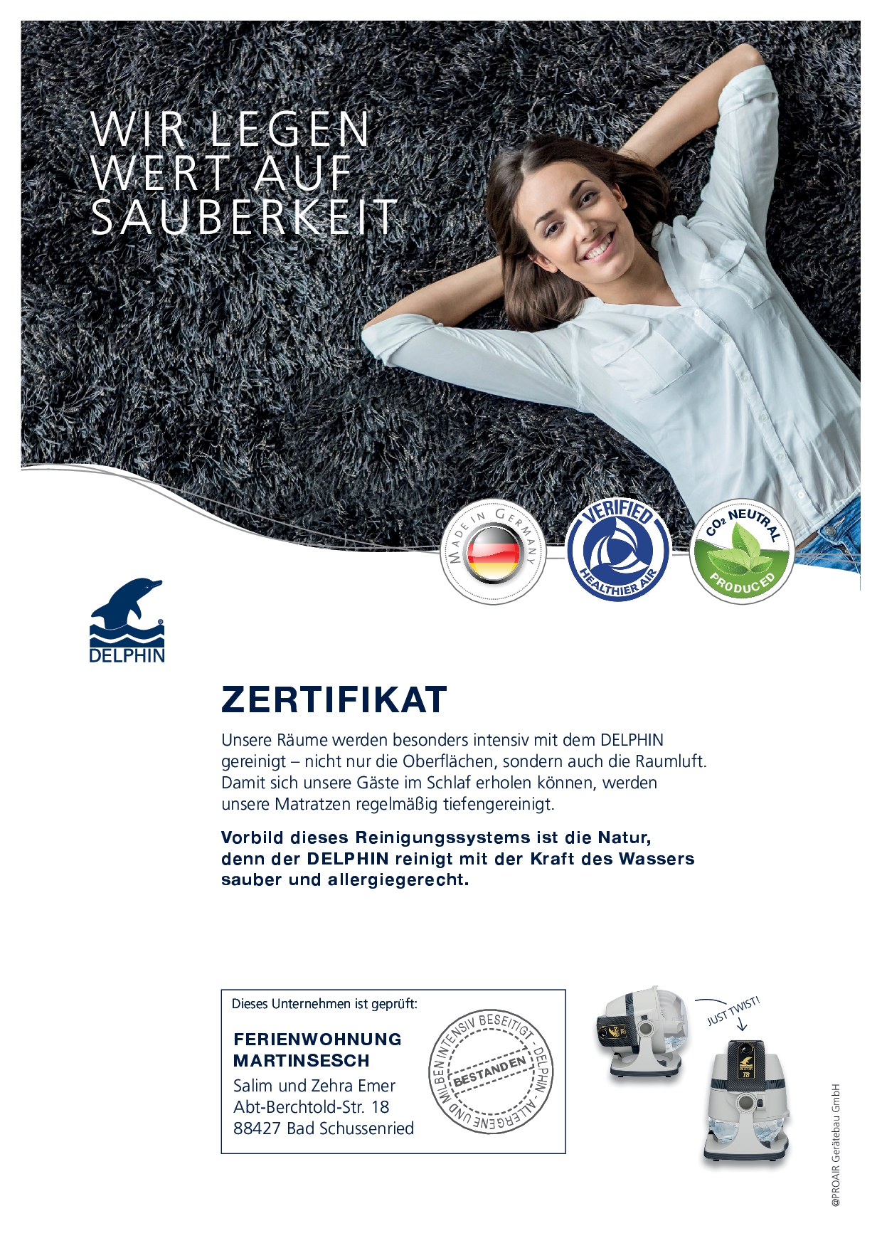 Unsere Räume werden besonders intensiv mit dem DELPHIN gereinigt. Nicht nur die Oberflächen, sondern auch die Raumluft. Wir sind überzeugt, dass Sie den Unterschied spüren werden und freuen uns darauf, Ihnen einen sauberen und komfortablen Aufenthalt zu bieten. Bei Fragen oder speziellen Anliegen stehen wir Ihnen jederzeit gerne zur Verfügung! Hier gelangen Sie zum Zertifikat